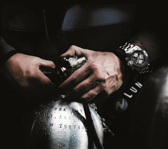 Case: stainless steel; water-resistant to 500 meters (1,650 feet / 50 atm); screw-in crown and safety timing button; unidirectional ratchet rotating bezel; arc sapphire crystal, anti-glare treatment on both sides; Diameter: 44 mm.