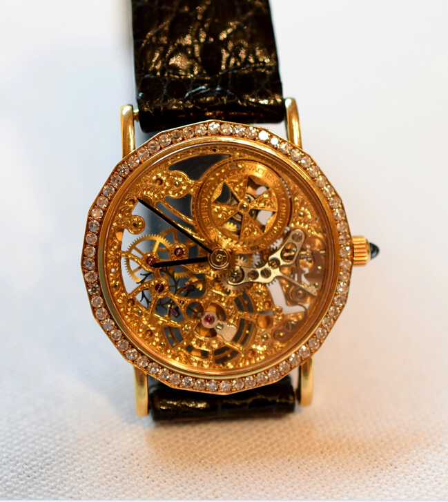 This watch was made in 1986, contains three functions, the hollow movement of the material is 18K gold, bezel set with sparkling diamond above. Dial craft is superb, amazing, crown inlaid with sapphire, dial diameter 25.5 mm. Price 10,000 to 15,000 US dollars.