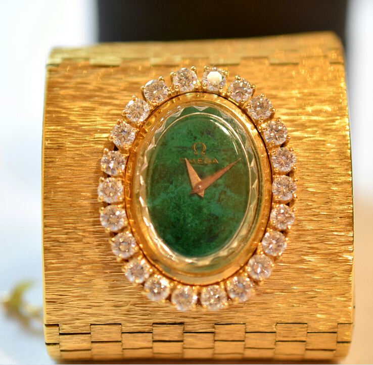 The biggest feature of this watch is retro, the overall design into the bracelet element, the bracelet is 18K yellow gold material, the dial is green malachite. The outer dial is set with diamonds and the pointers are gold. Looks very gorgeous. Price is 5000-7000 dollars.