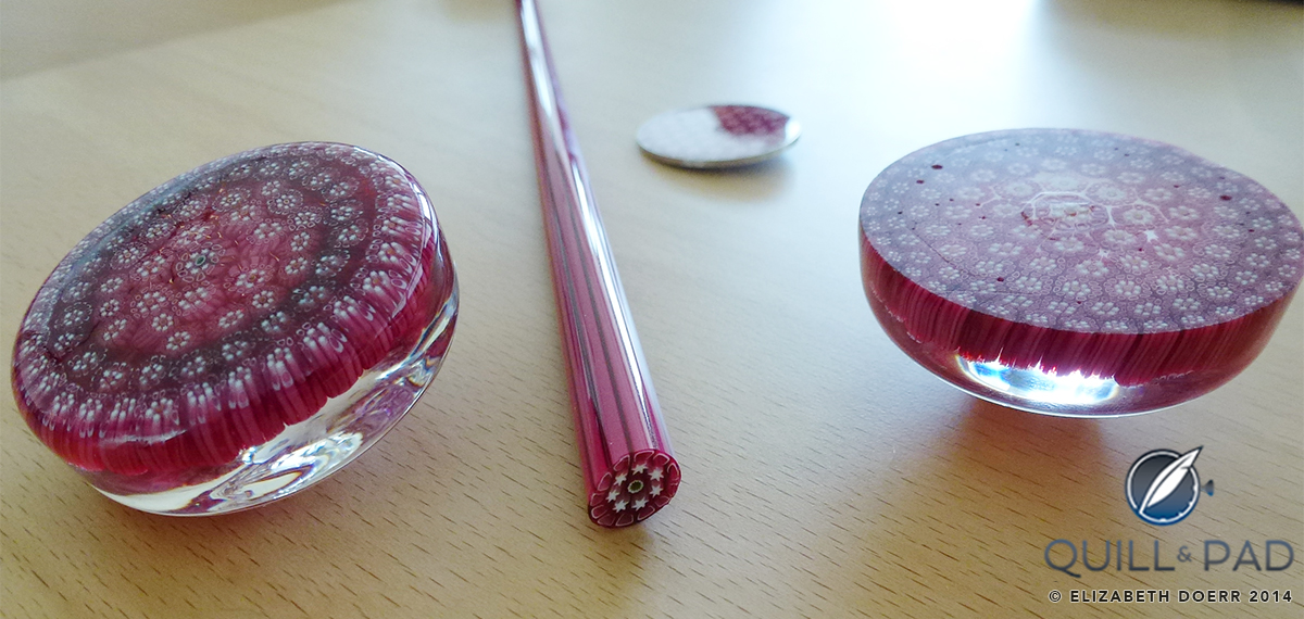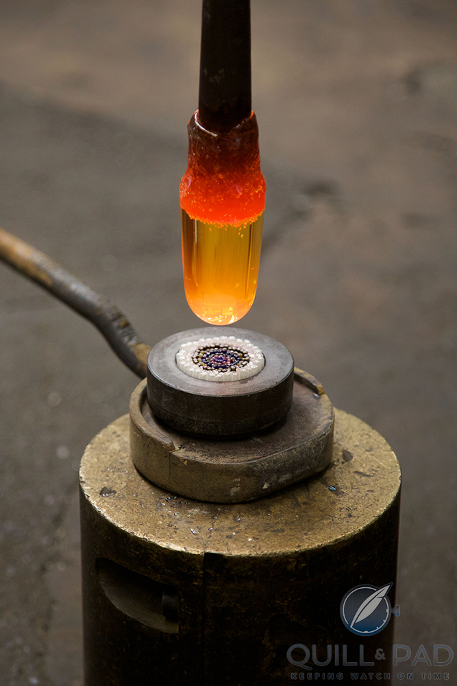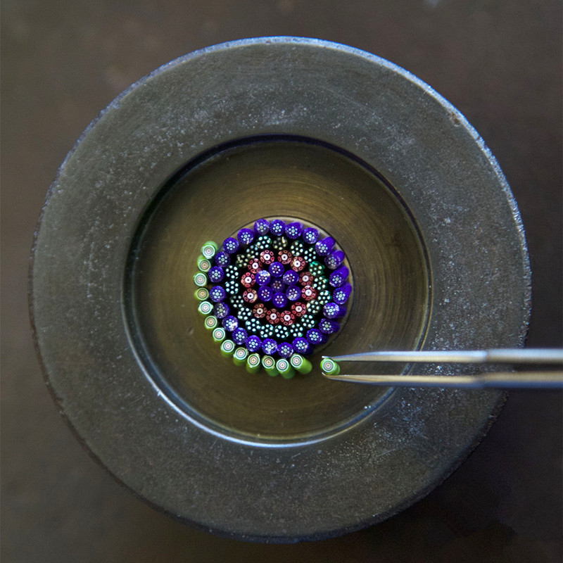 In order to complete the paper town, crystal craftsmen continue to add well-made stem until it becomes a sphere. The dial of the Arceau Millefiori watch is not as simple as it used to be to form a sphere, because in the end we needed a miniature paper dial. After finishing this mini paperweight, the craftsmen needed to send her to a German gemstone cutting specialist with high cutting accuracy, all of which had to be 0.6mm thick.