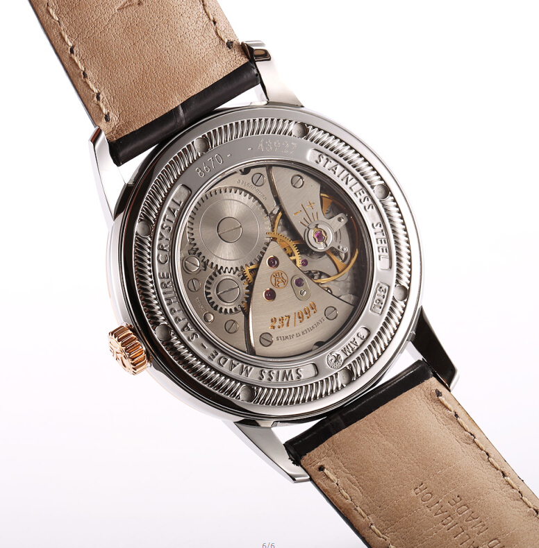 In the engraved style, this watch also made some modern aesthetics, the bottom of the bottom of the spiral guilloche spiral cover and the case presents a trapezoidal structure, just can hold up the outer edge of the case and wrist space increases Wear comfort, whether it is the bottom of the engraving or steel ring logo waterproof depth, material and number can be seen delicate handling of this table.